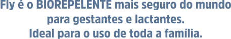 Fly tem ação biorepelente, desenvolvido para aplicação na pele, protegendo sua casa e família contra todos os tipos de insetos transmissores de doenças tais como pernilongos, muriçocas, borrachudos, moscas, mosquitos, piolhos, pulgas e carrapatos. Versões em spray (resiste até 9 horas) e pode ser usado desde crianças até idosos.