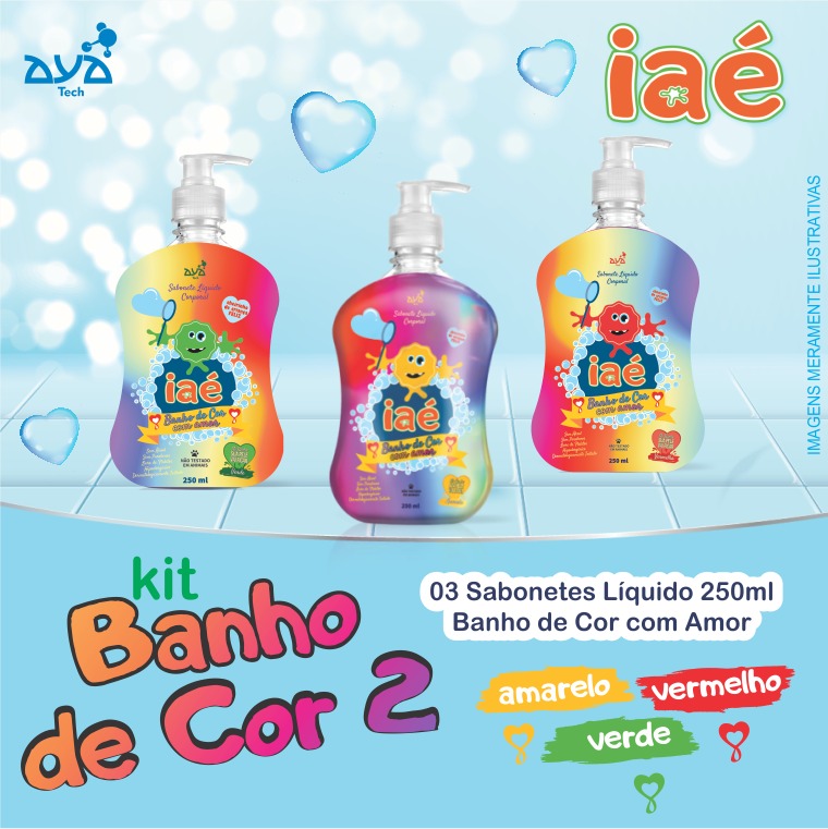 Sabonete Liquido um banho de cor com amor Iaé- proporciona uma limpeza delicada e divertida na pele, enquanto a perfuma com um cheirinho exclusivo de alegria e diversão.O sabonete banho de cor com amor ao entrar em contato com a pele úmida colore a pele, tornando o banho o momento mais divertido do dia.  Para coloração mais intensa aplique com a pele seca.